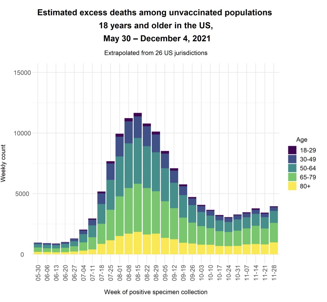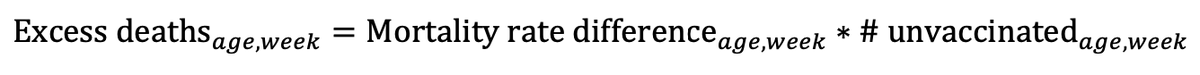 We then multiplied the mortality rate difference to the total number of unvaccinated individuals in the 26 jurisdictions by age group and week, to estimate the number of excess deaths 6/n