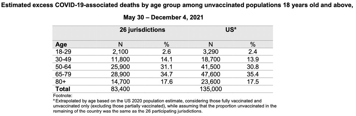 Note this accounts for age, and for the proportion of each age group vaccinated by week. The data are from only 26 US jurisdictions in which we estimated a total of 83,400 excess deaths from lack of vaccination. But we can extrapolate to the rest of the country 7/n