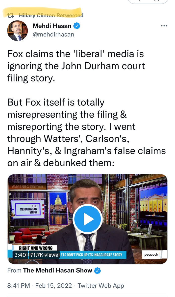 And another one. Shame on Fox News for messing up their reporting but the bigger news is that Hillary has now twice tweeted about Durham in one day. Before today, has she ever said anything about Durham at all?