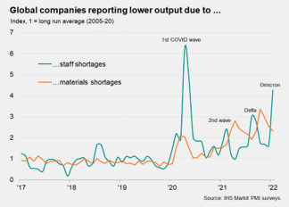 The widening spread of the Omicron variant led to renewed restrictions (imposed and voluntary) on service sector activity in some economies during December. Manufacturers meanwhile reported that constraints on production had eased, though nonetheless remaining a significant drag.