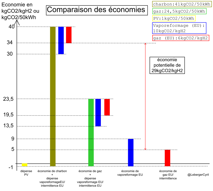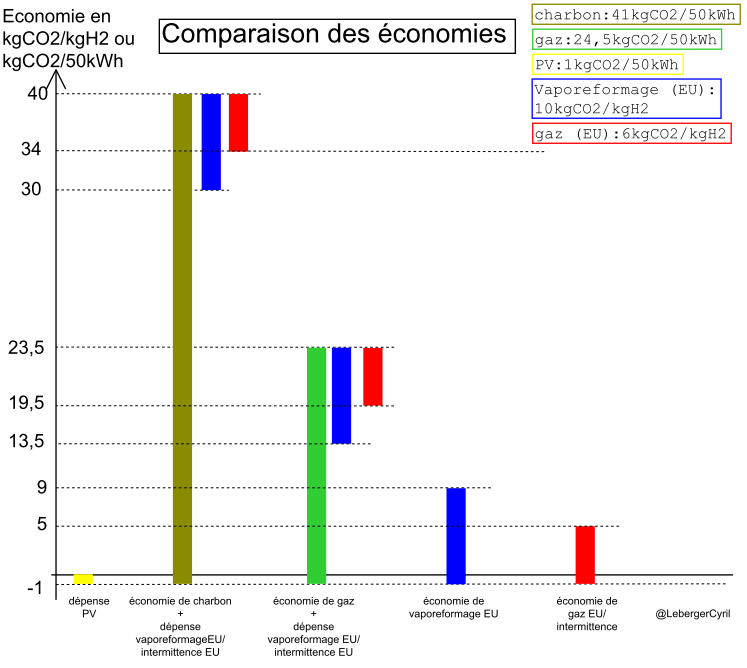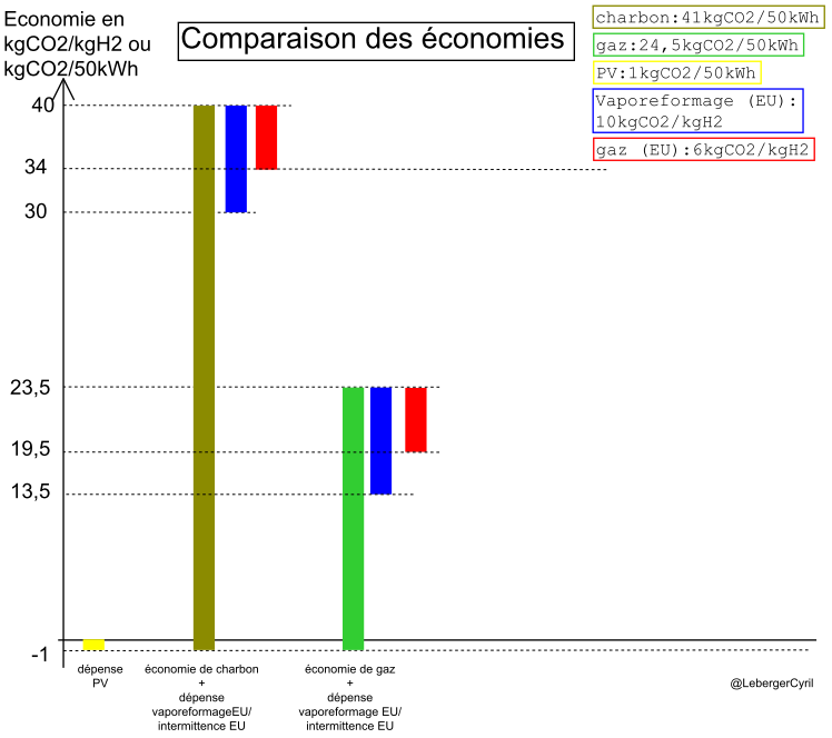 La perte s'élève même 29kgCO2/kgH2 si on préfère économiser du gaz en Europe afin de palier à l'intermittence des EnRi plutôt que d'économiser du charbon au Chili ou en Afrique du Sud.