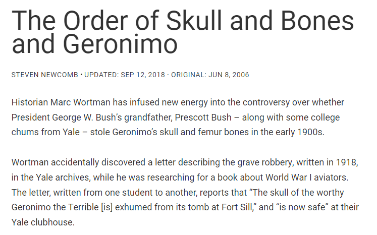 Nove anos após seu falecimento, o túmulo de Gerônimo foi profanado por alunos da Yale. O crânio foi roubado por membros da sociedade secreta Skull and Bones, à qual pertencia Prescott Bush, filho do magnata Samuel Bush e avô do futuro presidente dos EUA George W. Bush.