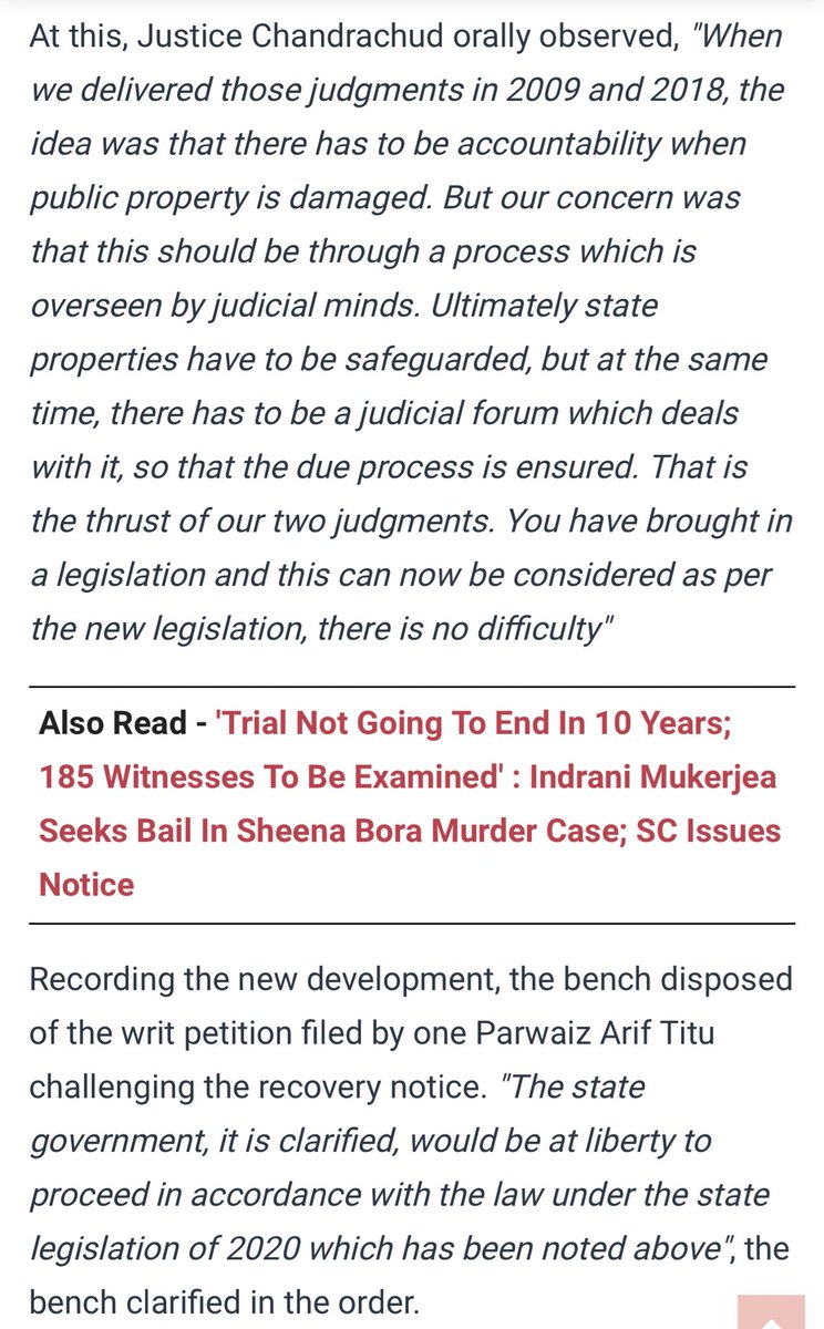 On Uttar Pradesh #CAA vandals, Supreme Court, disposing of the writ petition filed by one Parwaiz Arif Titu challenging the recovery notice, has ruled: “The State Government, it is clarified, would be at liberty to proceed in accordance with 2020 law.”