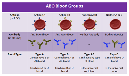 sangre. Si somos tipo A tendremos anticuerpos anti-B, los tipo B tienen anti-A, los AB no poseen anticuerpos, pero los O, poseen anti-A, anti-B y anti-AB. Esto es importante sobre todo en las transfusiones sanguíneas, ya que deben ser compatibles entre sí. Las personas del