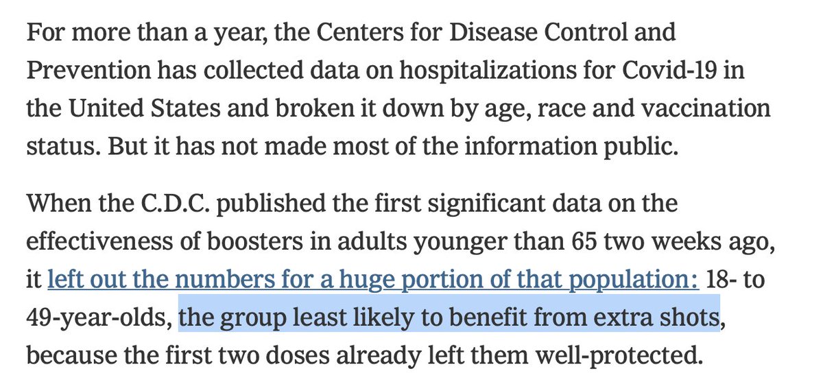 The never ending bias of reporting that people age 18-49 lack benefit of booster shots vs Covid hospitalization: the relative benefit the same in all age groups; absolute benefit per 100,000 people is substantial nytimes.com/2022/02/20/hea…
