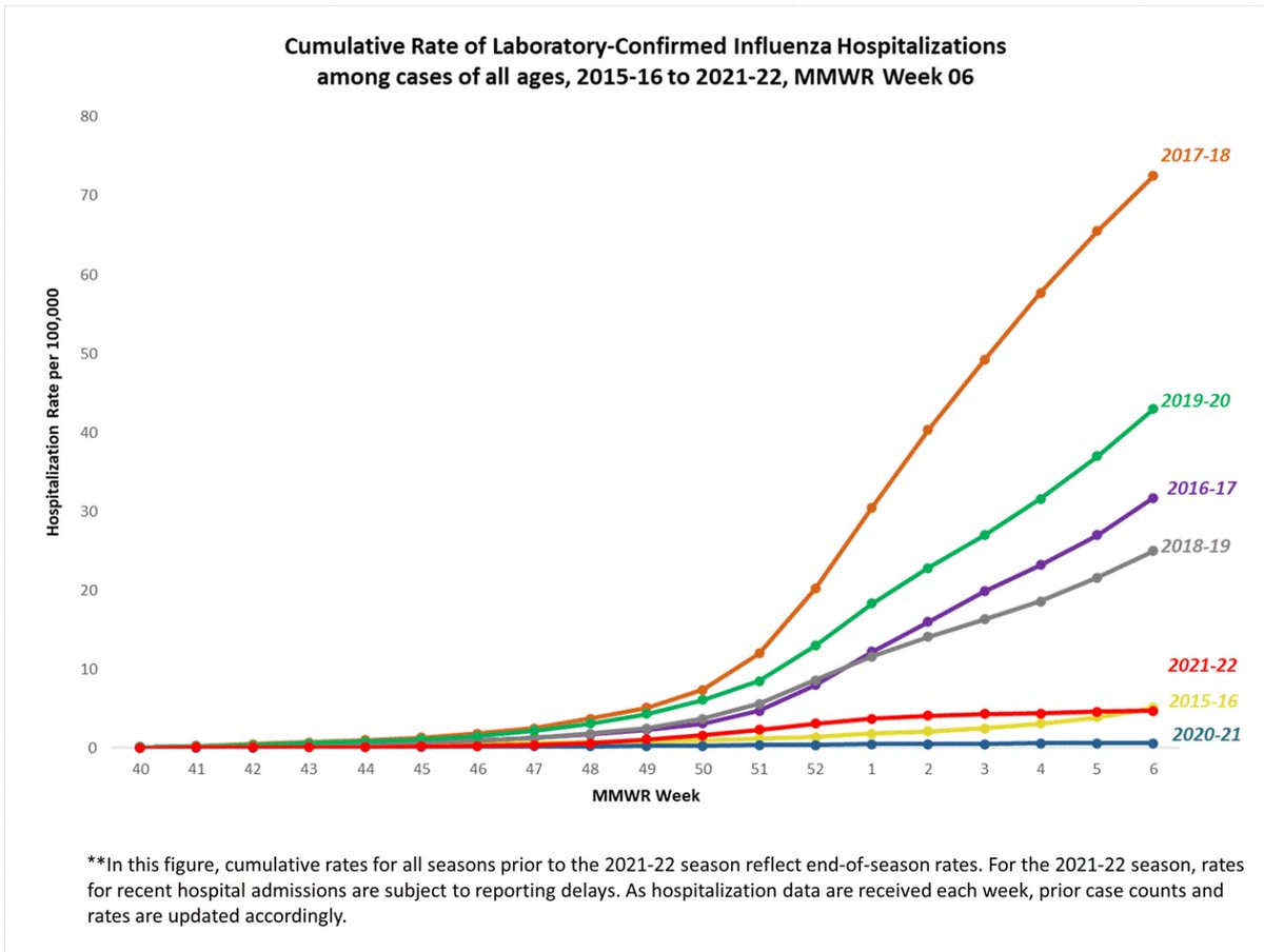 4. The rate of hospitalizations for #flu this winter is also low. Earlier this season it looked like 2021-22 was going to see a higher hospitalization rate than 2015-16, a historically mild season. But it looks like this year's rate is now below 2015-16.