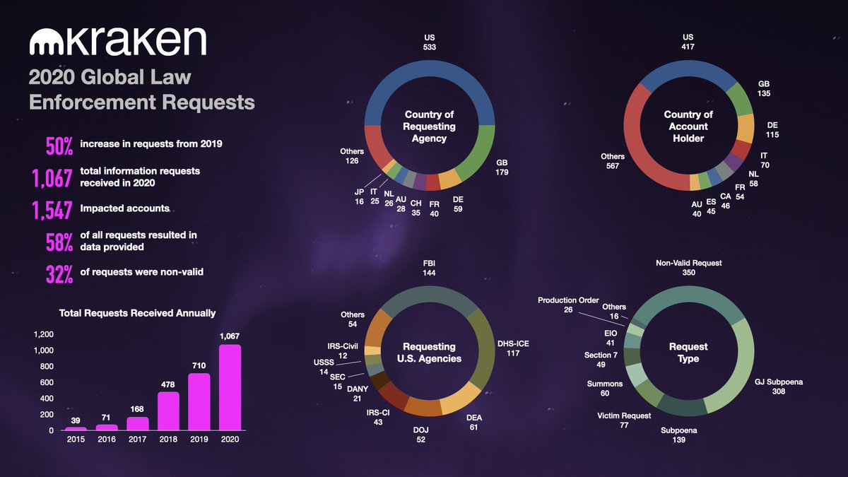 2020 Compliance Transparency Report. Total requests up 50% YoY, ~4 per business day. US lost share, down to 50% from 61% last year. FBI still leads. % of invalid requests up by 4% while productions are down 4%. Some invalid can become valid but these cases are especially taxing.