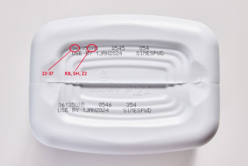4) Recalled Similac, Alimentum or EleCare powdered infant formulas can be identified by the seven- to nine-digit code and expiration date on the bottom of the package—first 2 digits are 22 through 37, the code contains K8, SH, or Z2, & expiration date is April 1, 2022, or later.