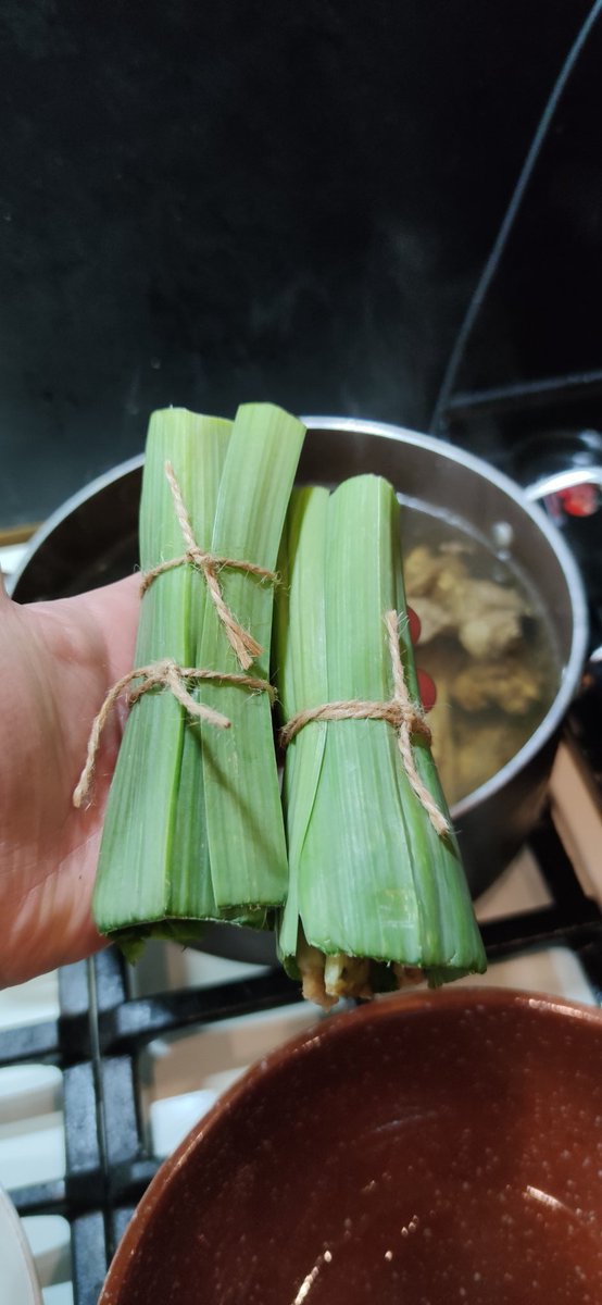 Я уже говорил, что буду стараться прикавказить этот суп. Поэтому собираю кавказский букет Гарни где вместо тимьяна стебли кинзы. Завернуты они в стебли лука порея, который в оригинале в рецепте присутствует, но лаврушку из букета я решил не убирать. Ну и шарашу это дело в бульон.
