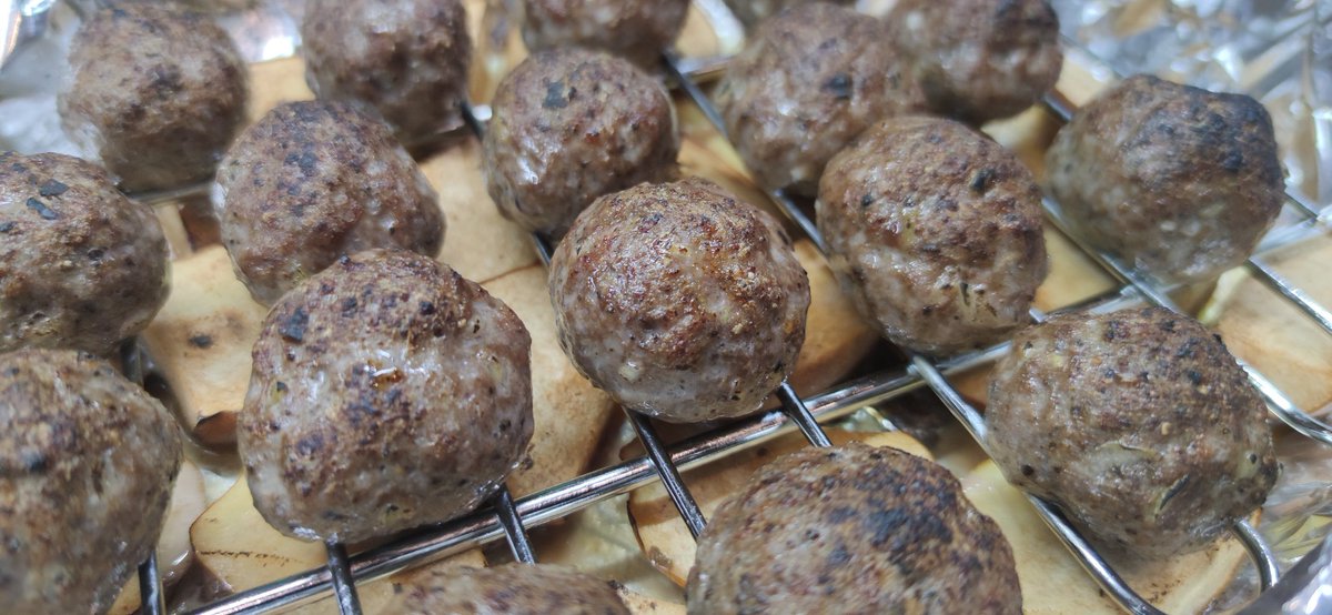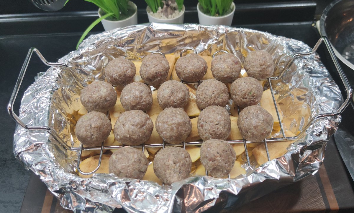 Собственно с фрикаделями тот же замес: подпекаем их на самом сильном огне, можно даже верхнего гриля им дать по быстрому. Айве жира хватит в любом случае.