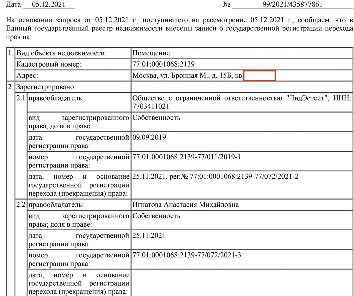 Справедливости ради, в России есть и ещё люди с такими ФИО. И просто по выписке из Росреестра нельзя точно установить, нет ли тут однофамильцев. Но в Ростехе и МГИМО Ведомостям не стали опровергать, что это именно та Игнатова