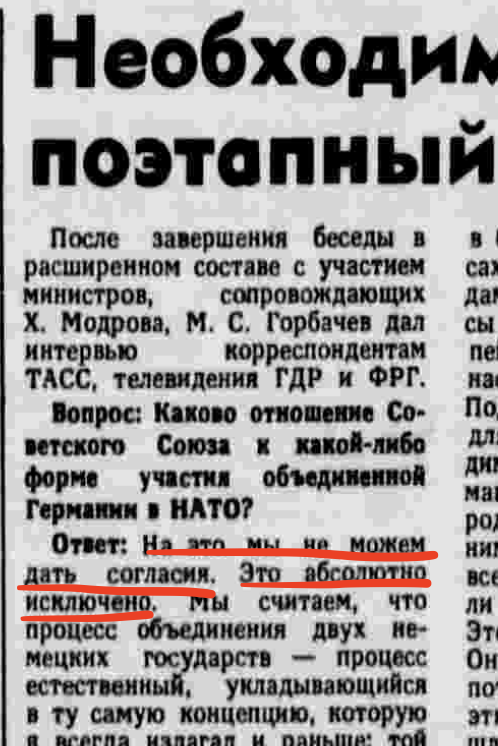 On March 7, 1990, Pravda published an interview with Gorbachev, which included the following question: "What is the Soviet Union's attitude towards any form of united Germany's participation in NATO?" To which Gorbachev said: "We cannot agree to it. This is completed ruled out."