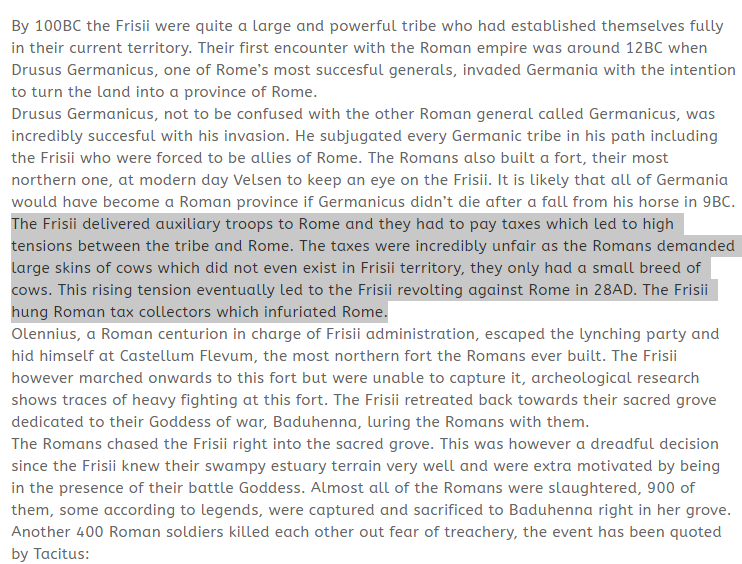 Quickly turned into tributaries, their Roman history remains "rather uneventful", mainly providing troops and leather or participating in the occasional revolt. Many a battle had Frisii fighting on both sides.