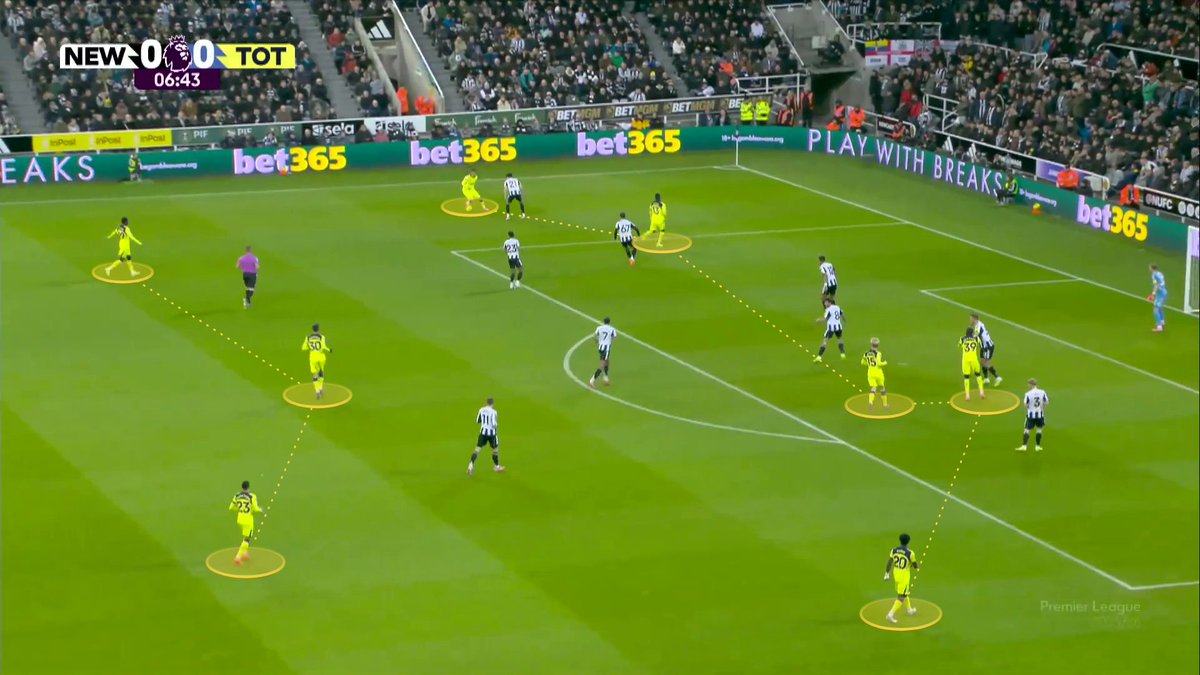 Higher up, Porro inverted into the back 3, Bentancur and Sarr formed a double pivot, and Udogie inverted into the half space between the lines with Johnson holding the width.