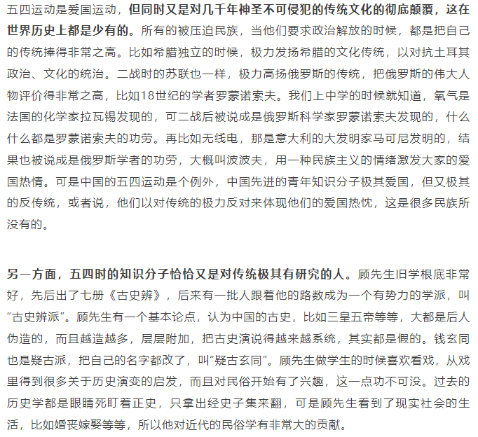 可是中国的五四运动是个例外,中国先进的青年知识分子极其爱国,但又极其的反传统,或者说,他们以对传统的极力反对来体现他们的爱国热忱,这是很多民族所没有的。