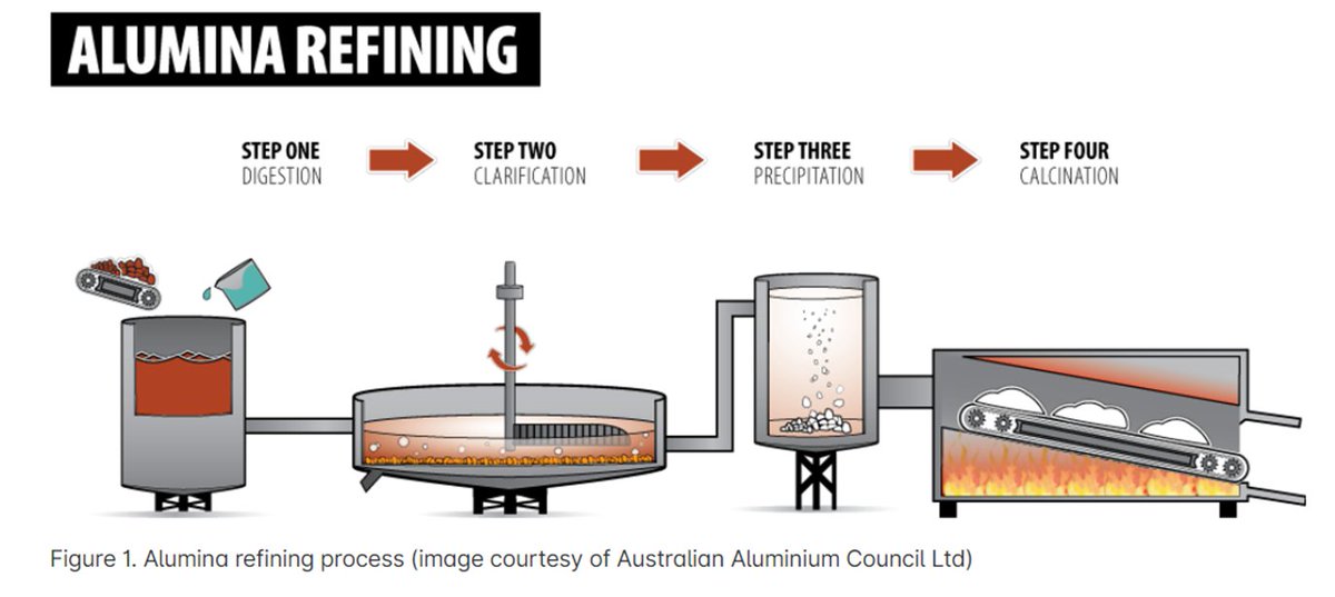 Step 2: Pure aluminium oxide, called alumina, is extracted from bauxite via a process called refining (Caustic soda is used to dissolve the aluminum compounds found in the bauxite)