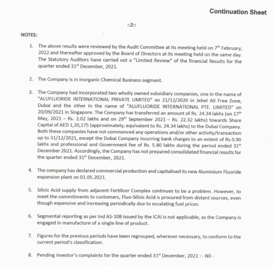 Thesis: 5. Location advantage for both raw materials & produced material 6. Application of AlF3 growing beyond Aluminium production 7. India & UAE's trade pact should help with its exports (+ they have a subsidiary in UAE) 8. AlF3 production requires costly lab set ups
