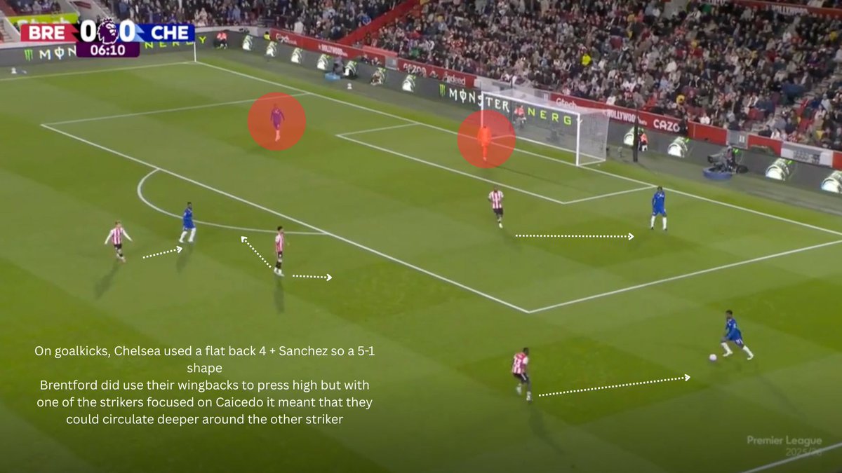 On goal kicks we saw Brentford try to press high but with a flat back 4 + GK Chelsea almost always had a free man and were able to circulate.