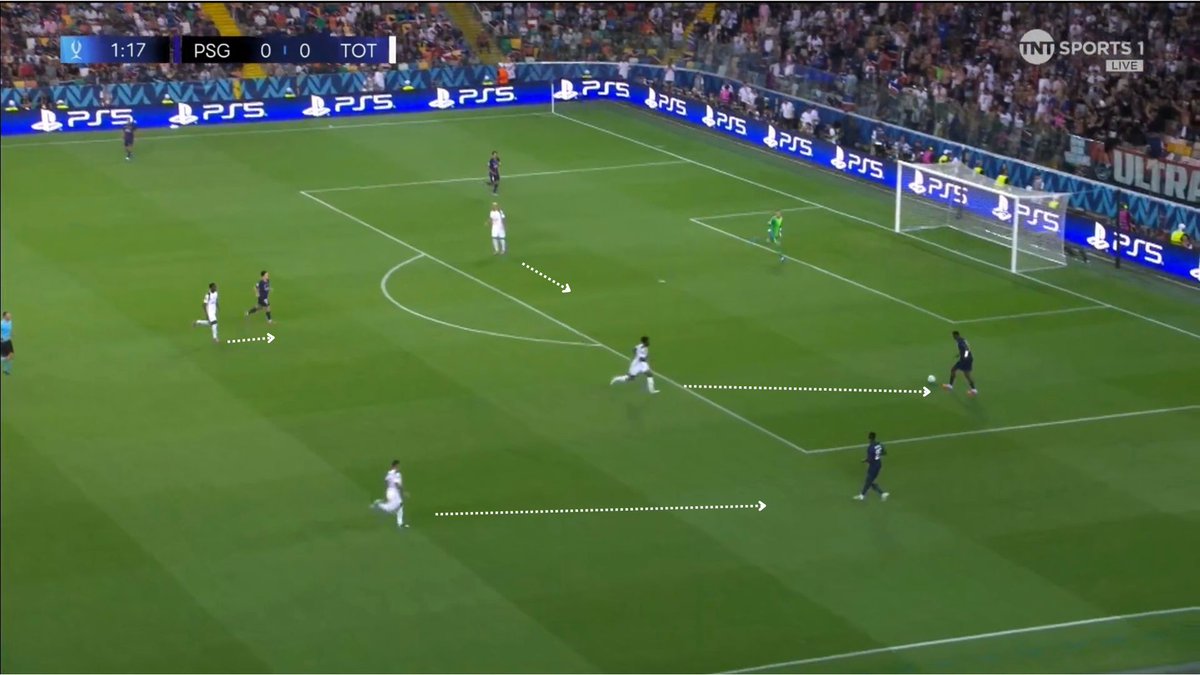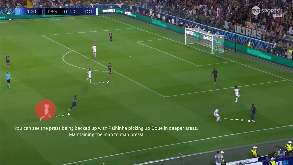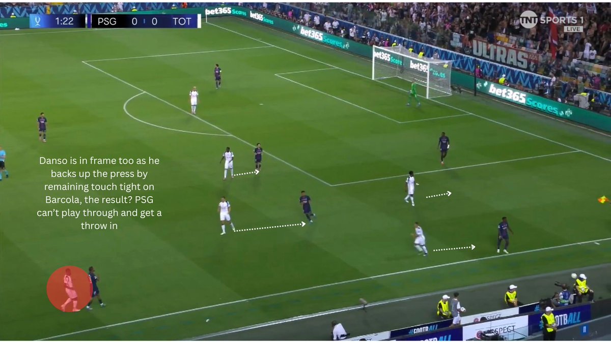Sarr was ready to pounce on Vitinha, the strikers pressed the 2 cbs, and the Spurs wingbacks pressed the PSG fullbacks.