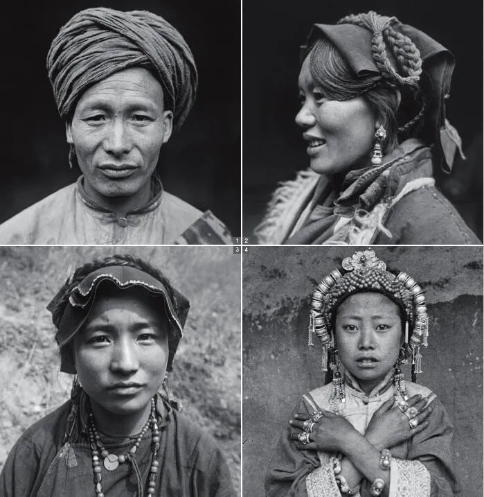 四张肖像照片分别是古尔沟的藏民、古尔沟的藏族妇女、黑水的藏族姑娘、喜好装饰的藏族上层妇女。