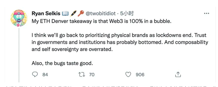 “我对ETHDenver大会的看法是,web3 100%处于泡沫之中,我认为随着封锁的结束,我们会回到优先考虑实体品牌的阶段,对政府和机构的信任可能已经触底,可组合性和自我主权被高估了。”