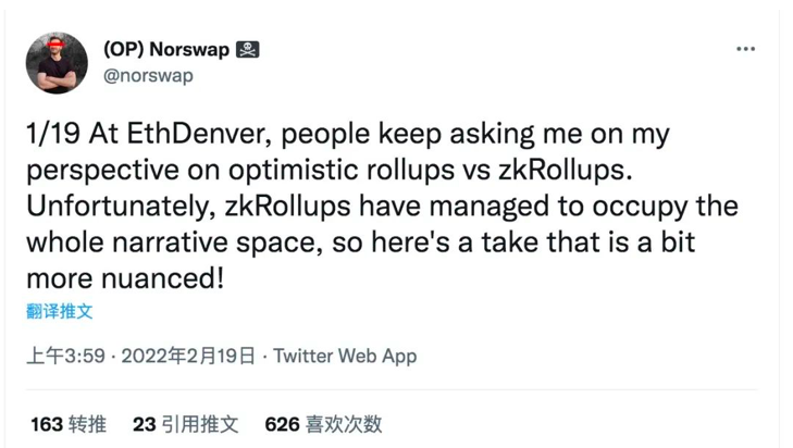 比如关于ZkRollup和Optimistic Rollup二层扩容方案孰优孰劣的讨论又有了新的发展,OptimismPBC开发者(OP) Norswap 发推文称: