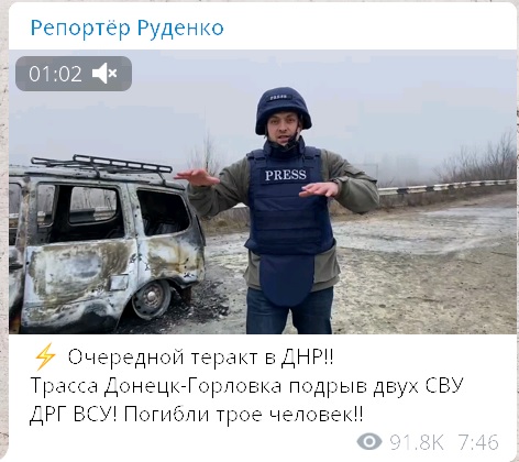 Российские пропагандисты опять распространяют фейки о неких действиях ДРГ ВСУ на оккупированной территории Донбасса. Сообщают, что ДРГ ВСУ якобы подорвала СВУ на трассе Донецк-Горловка в результате чего якобы погибло 3 гражданских