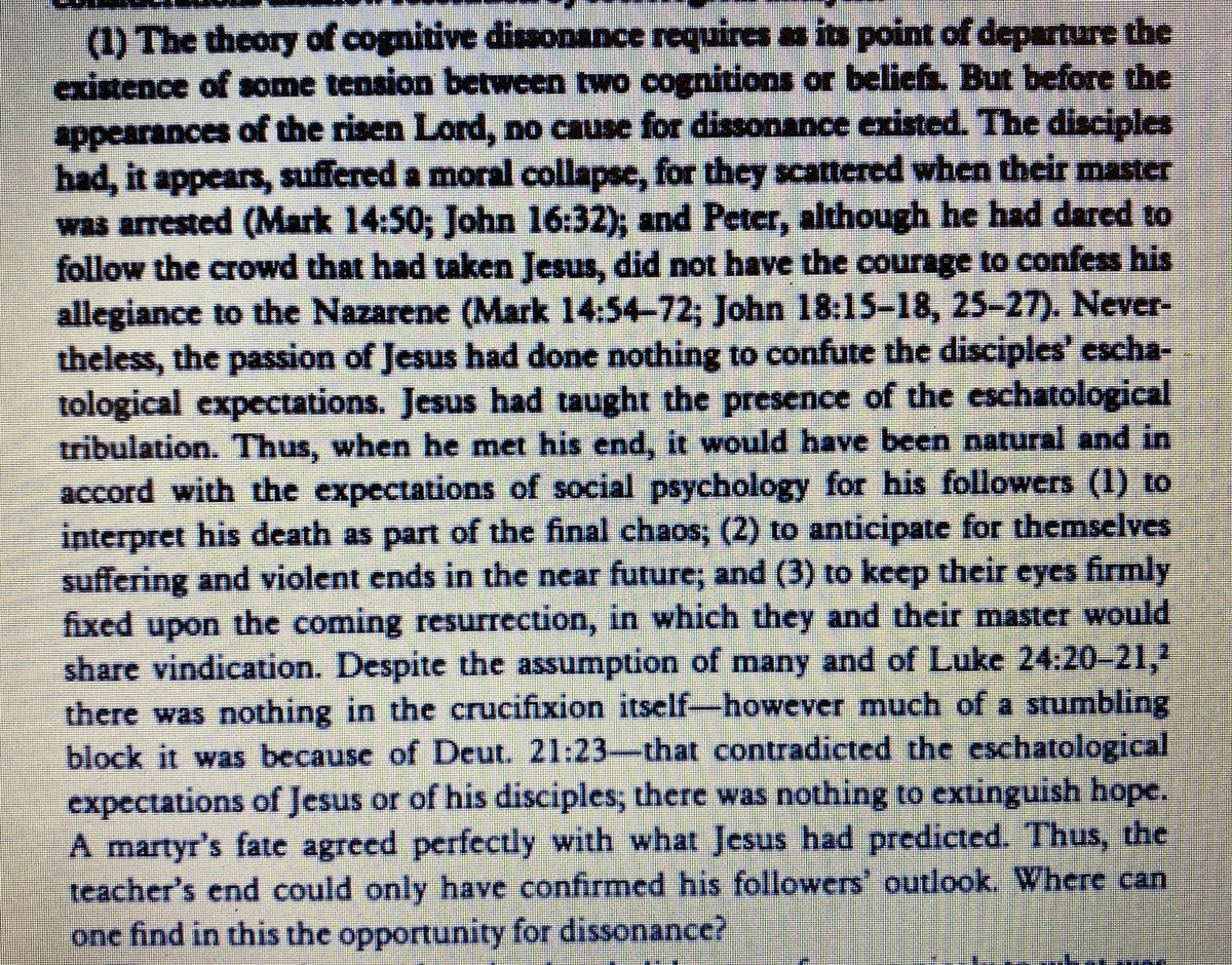 When Jesus was instead arrested and brutally crucified, the cold reality of his death powerfully disconfirmed their strongly held beliefs. The crucifixion, in other words, plunged Jesus’ followers into a state of cognitive dissonance.