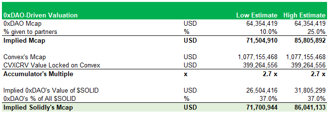 Dividend yield represents the cashflows generated by the protocol that are directly attributed to token holders. The low estimate uses $CRV staking yield of 6% and high of 2.3% based on Listed Exchanges. This gives $SOLID an initial Mcap range of $66M to $176M