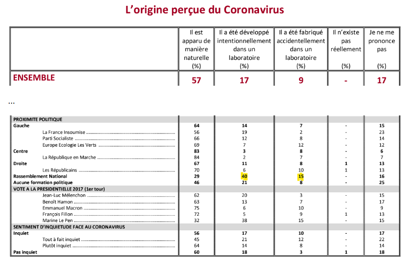 Si l’on ajoute à ces 40%, les 15% de sympathisants RN qui considèrent que le coronavirus a été fabriqué de manière accidentelle en laboratoire, une majorité des sympathisants RN considèrent donc que le Covid19 a été fabriqué en laboratoire. (*S2)