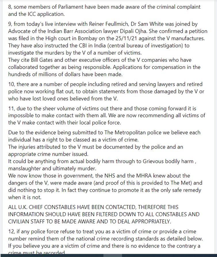 The police find no merit in conspiracist allegations that the vaccine programme amounts to negligence, manslaughter or misconduct in public office. They note that claims about a criminal investigation are being used to disrupt vaccination sites. news.met.police.uk/news/update-as…
