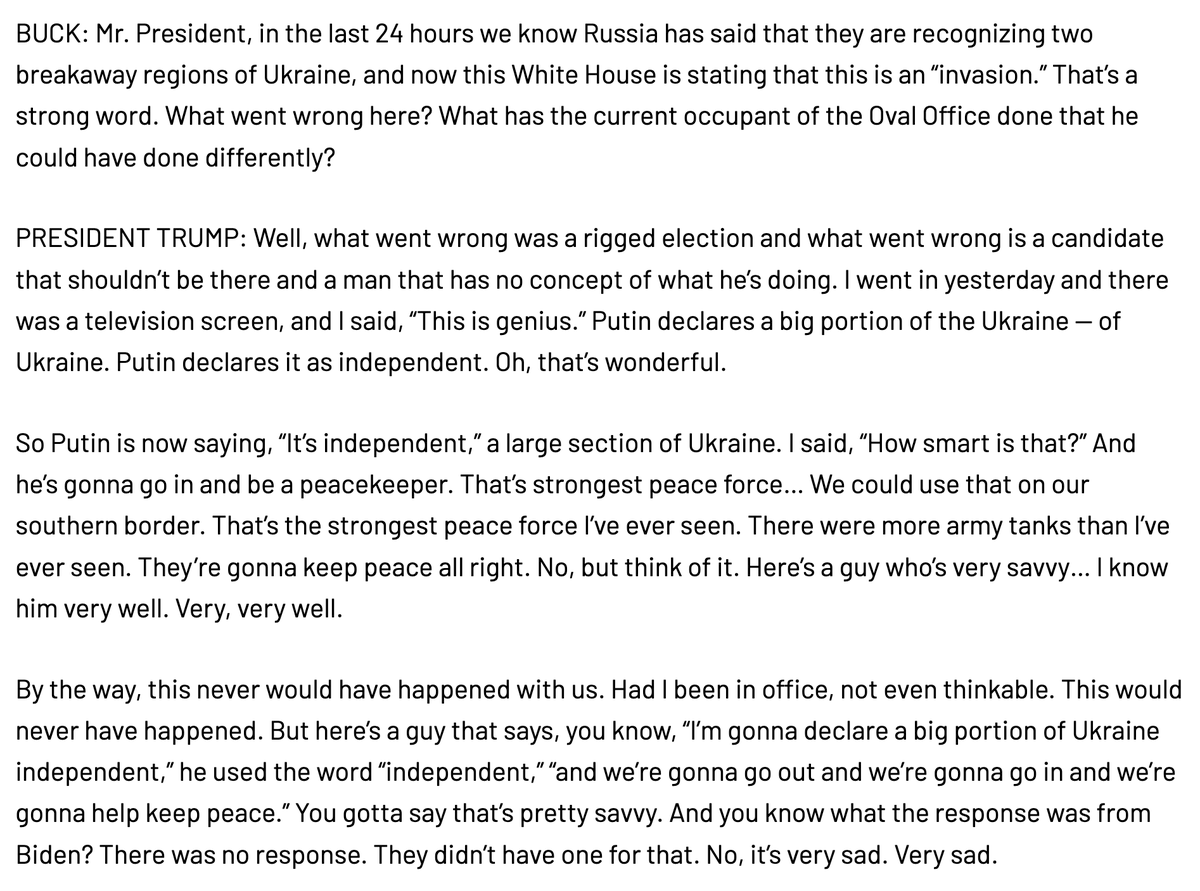 Likely 2024 Republican nominee: "I said, 'This is genius.' Putin declares a big portion of the Ukraine - of Ukraine. Putin declares it as independent. Oh, that's wonderful. So Putin is now saying, "It's independent,' a large section of Ukraine. I said, 'How smart is that?' 1/6