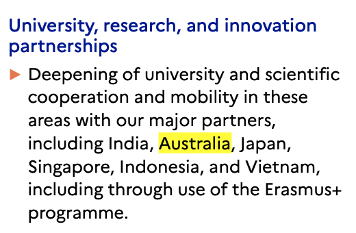 On university and scientific cooperation and mobility, Australia is described as a "major partner" together with India, Japan, Singapore, Indonesia or Vietnam. The π«π·π¦πΊ science and innovation roadmap, signed April 2021, is specifically mentioned.
