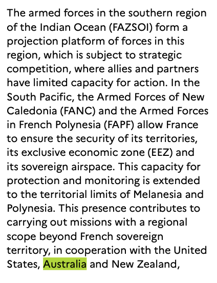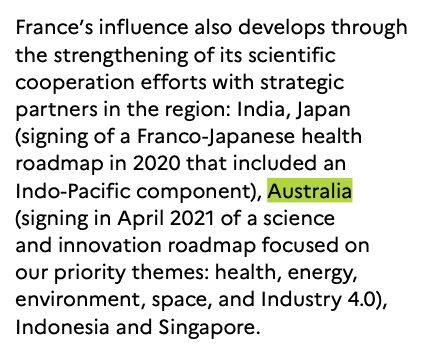 First, the strategy clearly states that "France will pursue bilateral cooperation with Australia on a caseβbyβcase basis, according to its national interests and those of regional partners", which could leave room to quite a substantive cooperation as noticed by @Rory_Medcalf.
