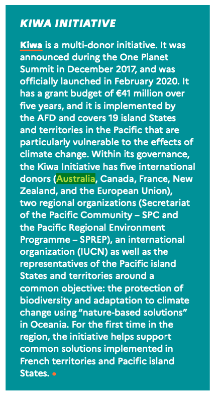 Same on the economic support to Pacific Island states. France commits to "cooperate more closely with other bilateral donors such as Australia, Japan, New Zealand and India". The Kiwa Initiative (π¦πΊπ«π·π¨π¦π³πΏπͺπΊ) is mentioned as an example of that cooperation.