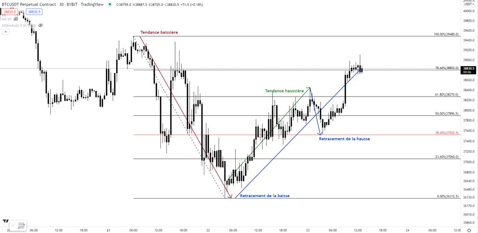Dans le cas d'un retracement, Fibonacci permet d'identifier les zones clés d'une impulsion.