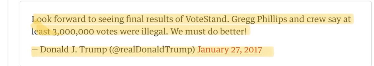 We’re going to a place I know you don’t want to. Just know we are going there together. The year is 2017 and one week after inauguration, trump has tweeted about 3m ‘illegal’ votes. Stay with me on this one. A wee thread on Election Integrity🧵👇🏻