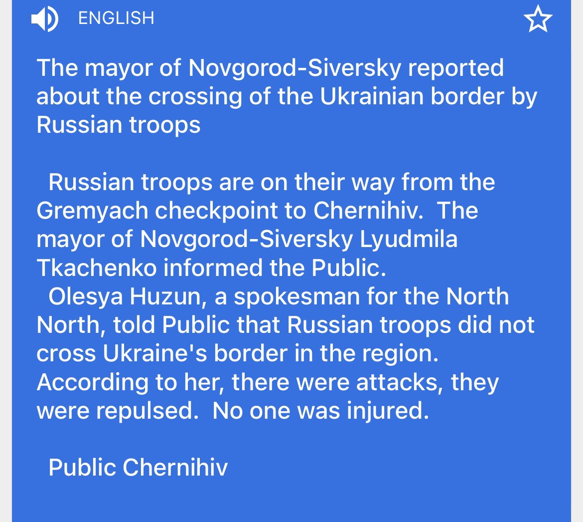 Mixed messages up north. Chernihiv is the first major town you would reach if you entered from Belarus and took the highway to Kyiv. This is google translate from a local Telegram group message in Ukrainian.