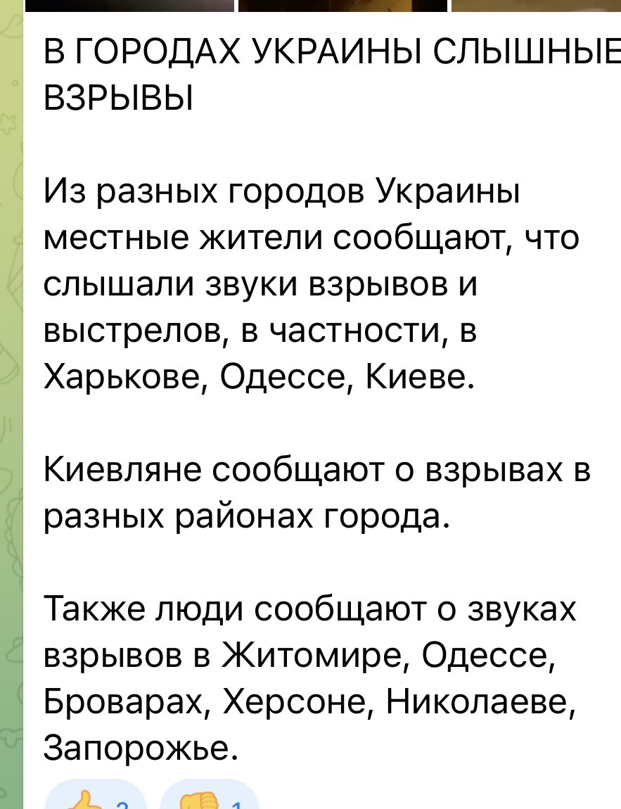 A chat from Chernihiv says explosions were heard in Kharkiv, Odesa, Kyiv, Zhitomir, Kherson, Zaporozhe, etc.