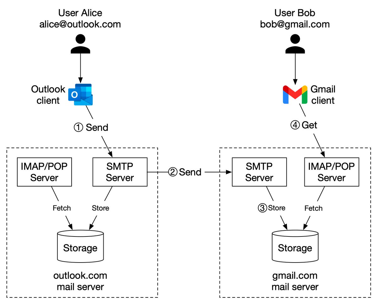 2. Outlook mail server queries the DNS (not shown in the diagram) to find the address of the recipient’s SMTP server. In this case, it is Gmail’s SMTP server. Next, it transfers the email to the Gmail mail server. The communication protocol between the mail servers is SMTP.3/5