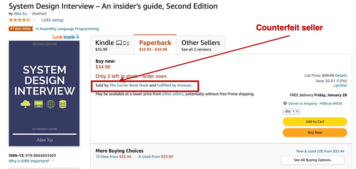 I'm the author of the best-selling book System Design Interview-An Insider’s Guide. 11 days ago, two fraudsters hijacked the "Buy Now" button on Amazon, fulfilling all orders with a different book. I'm helpless to do anything. A sad story on self-publishing: a thread.