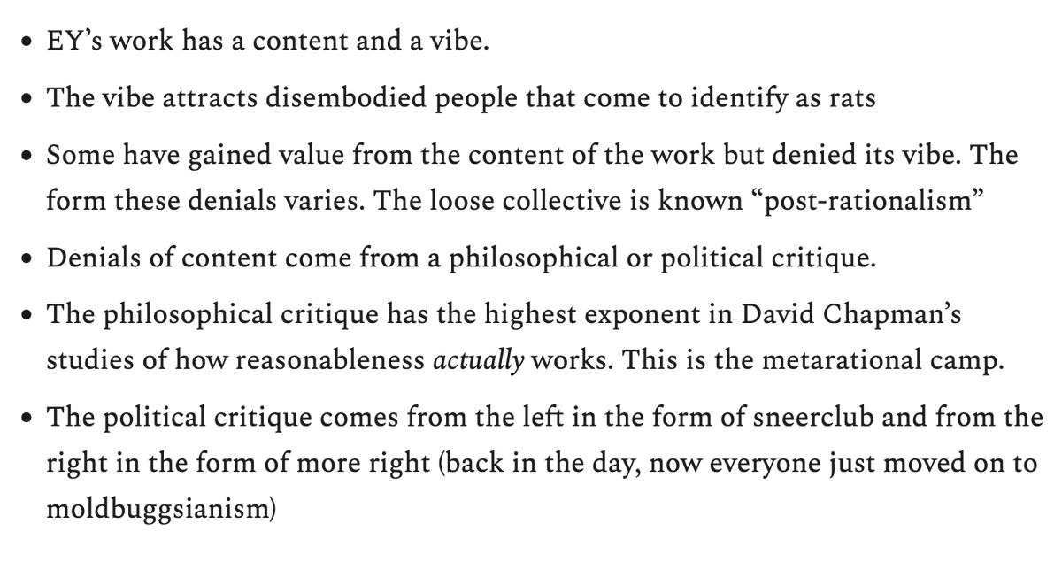 @FluidityAudio@nosilverv I also wasted a lot of effort trying to find some specific content in LW rationalism. I have a professional interest in different rationalist theories (going back 40+ years now). It took me years to figure out that there’s nothing at the center; it’s all vibe and no substance.