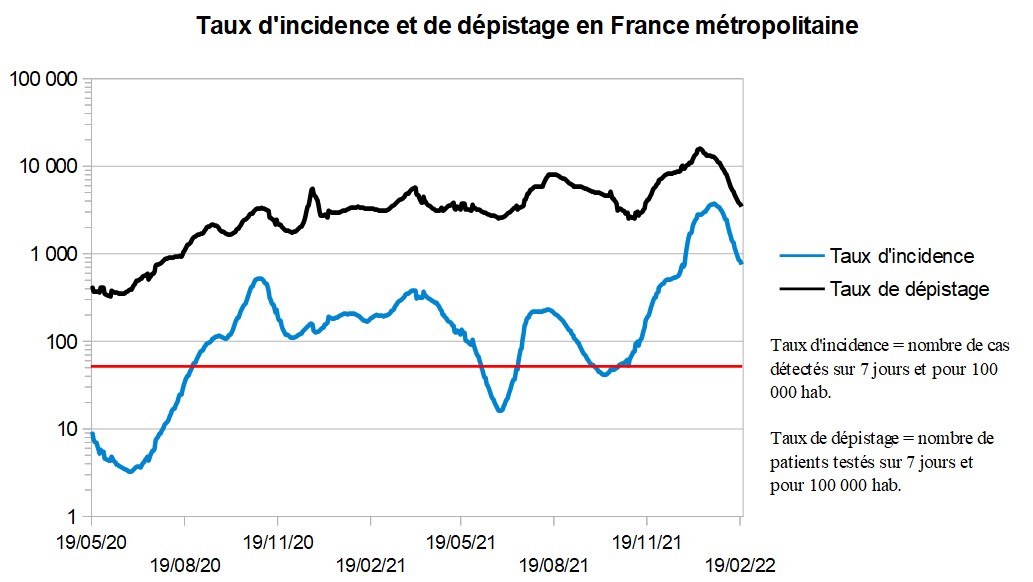 Carte du taux d'incidence par département (nombre de cas détectés pour 100 000 habitants sur les 7 derniers jours disponibles, ici du 15 au 21 février 2022).