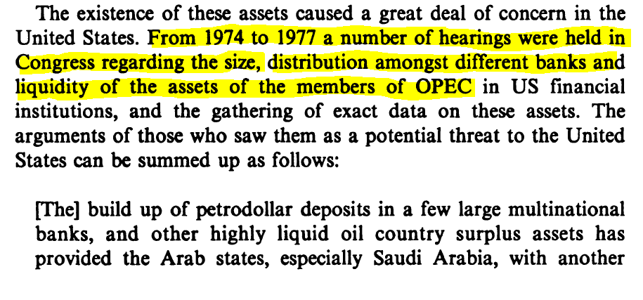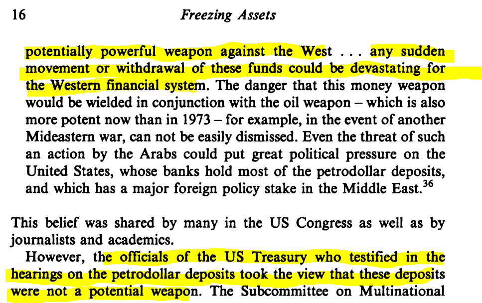 What's interesting here is that the modern legal foundation for the US gov'ts capacity to sanction by freezing foreign gov't assets (w/in domestic & overseas US financial institutions) is based on a law passed b/c of fears of coordinated OPEC dollar sales.