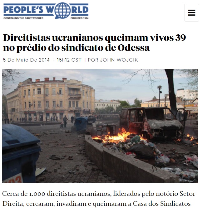 Cenas do Massacre na Casa dos Sindicatos de Odessa, ocorrido na Ucrânia, em 02/05/2014. Sede de organizações sindicais e do Partido Comunista, o edifício foi atacado e incendiado por neonazistas apoiadores do Euromaidan. A chacina resultou na morte de 42 pessoas.