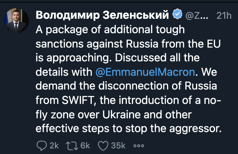 9/P.S. Puede ser menos dramático, pero cerrar los aeropuertos a los vuelos rusos, excluir a Rusia del sistema bancario, hacer un embargo económico y congelar relaciones diplomáticas (que es lo que pide Zelensky, no tropas) es lo que deberíamos estar exigiendo que se haga