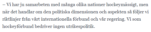 13. Allt detta ovan är väl känt. Det gällde bara att samla ihop materialet. Men det intressanta ur svenskt perspektiv: Hur förhöll sig svenska ishockeyförbundet till dessa kopplingar, som man naturligtvis såg från första parkett.>