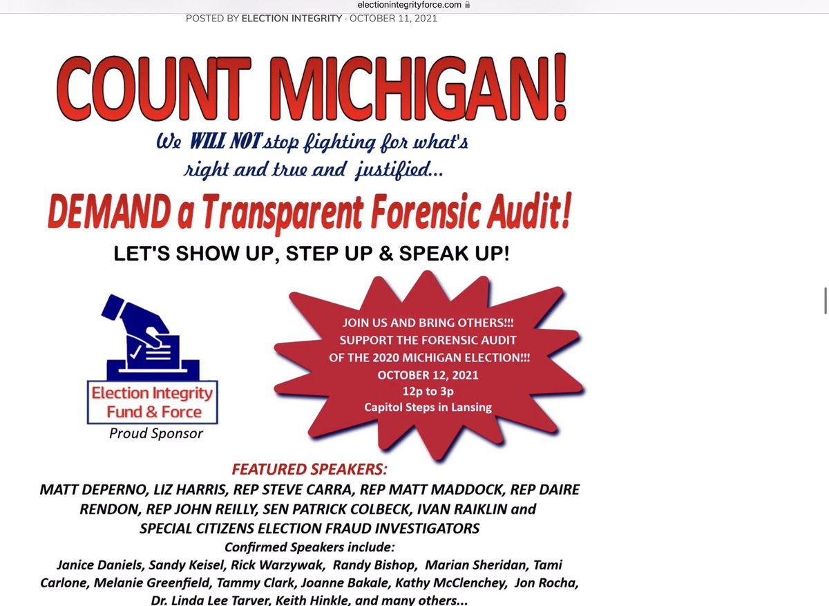 On October 12, 2021, the Election Integrity Fund & Force (📌1) was a proud sponsor of a rally at the Michigan Capitol. That rally was to demand an audit of the 2020 election, about eleven months after it was over.