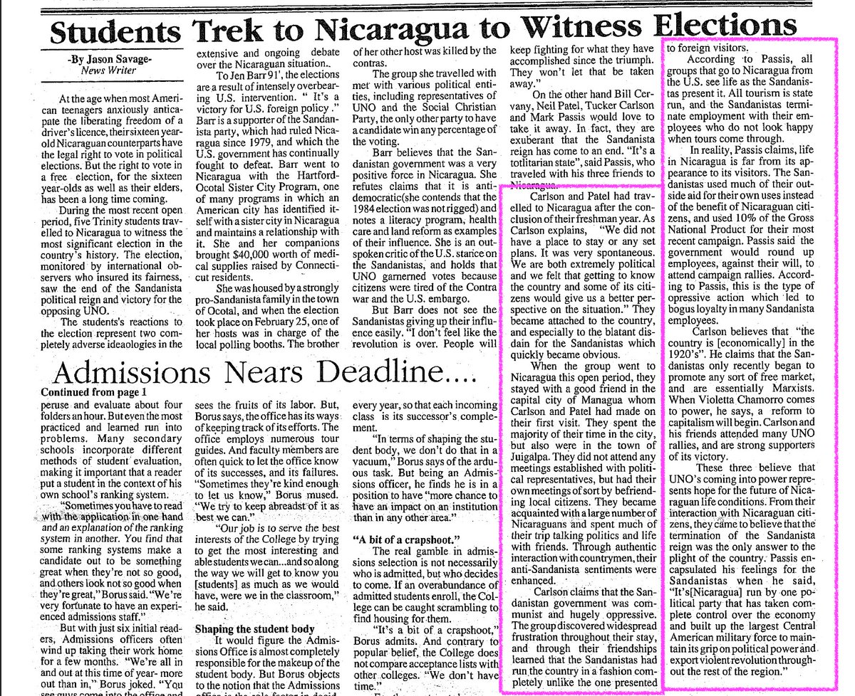 An old newsletter from his college reveals that he went to Nicaragua on at least two occasions.