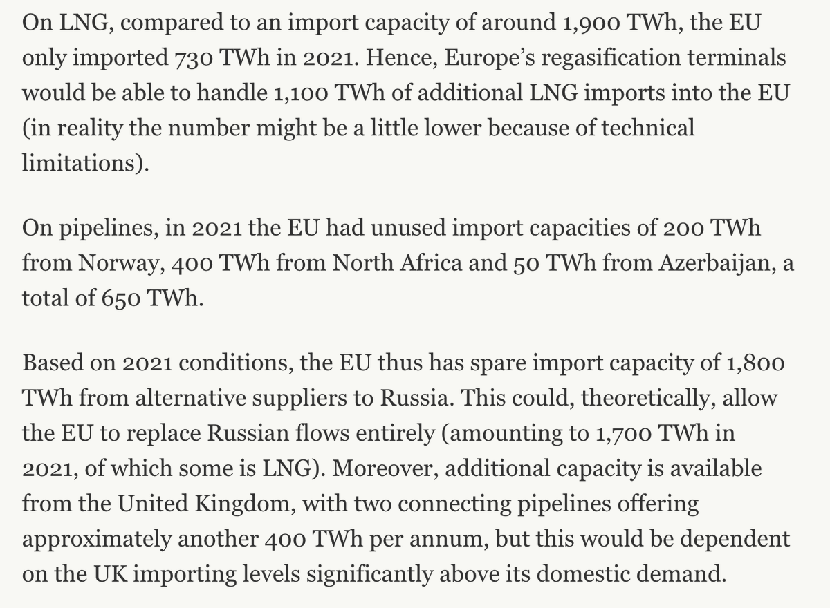 Seems that technically, EU has spare import capacity to displace Russia if supplies could be kept up through off-peak periods, but lots of technical & political challenges